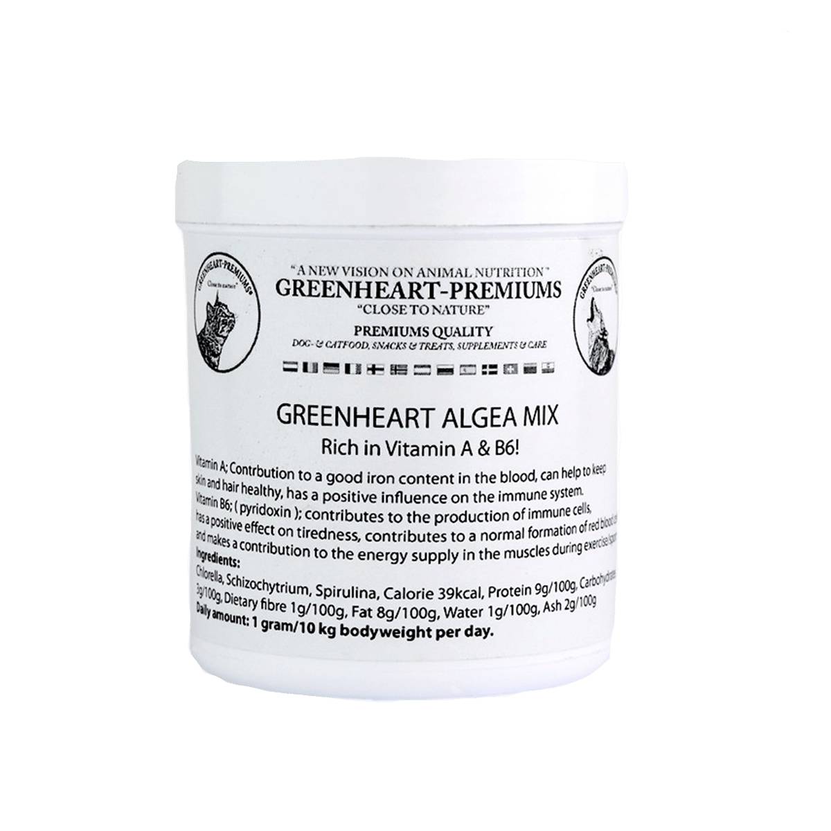 La espirulina, una pequeña alga verdiazul, contiene más del 70% de proteínas vegetales y sales minerales en grandes cantidades: hierro, zinc, magnesio, etc., pero también vitaminas, como la vitamina B, clorofila, que depura el organismo , aminoácidos y antioxidantes. Se recomienda para combatir el estreñimiento, estimular la regeneración celular y luchar contra el envejecimiento, fortalecer el sistema inmunológico, en caso de fatiga severa, para perros atléticos, mejora la capacidad de resistencia y recuperación y el aspecto externo de nuestra mascota.