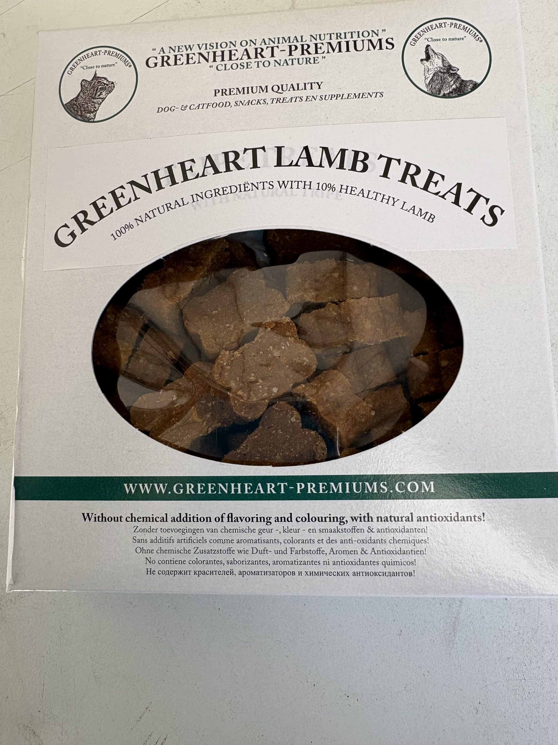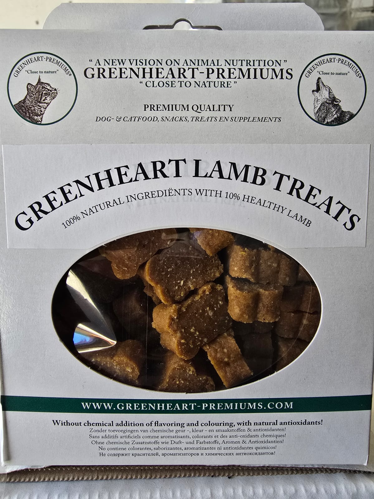 Los snacks de cordero Greenheart son ricos en cordero natural, 10% cordero, y no contienen gluten de trigo.